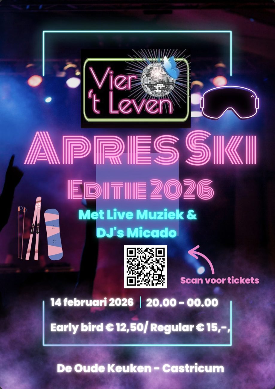 Haal die foute skipakken, mutsen en skibrillen maar weer uit de kast, want het is weer tijd voor een gezellig feestje van Vier het Leven. Op zaterdag 14 februari verandert De Oude Keuken in een knusse berghut vol muziek, gezelligheid en een winterse sfeer. Denk aan dampende glühwein, koude biertjes, meezingen met de grootste après ski hits en natuurlijk dansen tot je niet meer kunt! Samen maken we er één groot feest van.